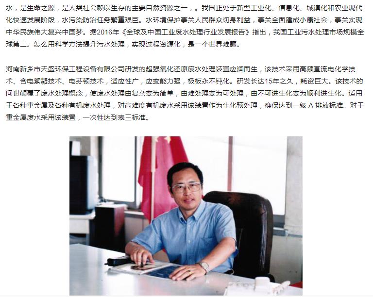 中國高新技術(shù)網(wǎng)發(fā)布:《關(guān)注:解碼科技創(chuàng)新》——新鄉(xiāng)市天盛環(huán)保“超強氧化還原廢水處理技術(shù)”